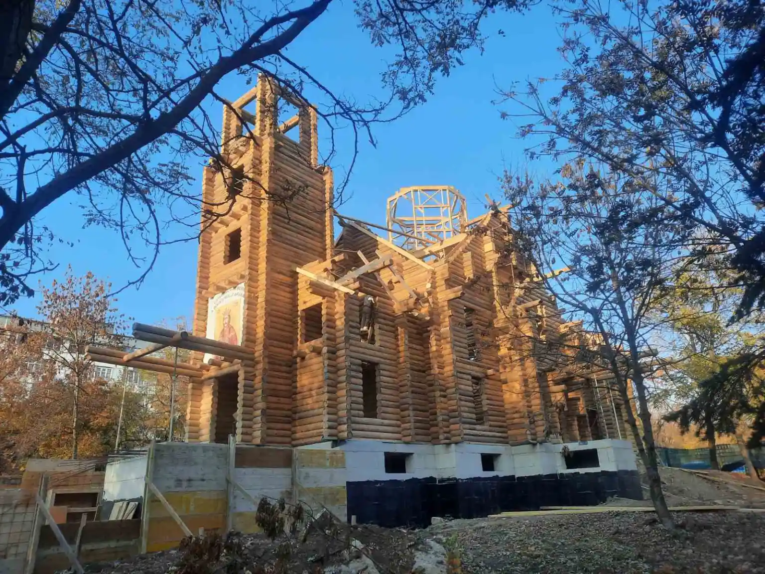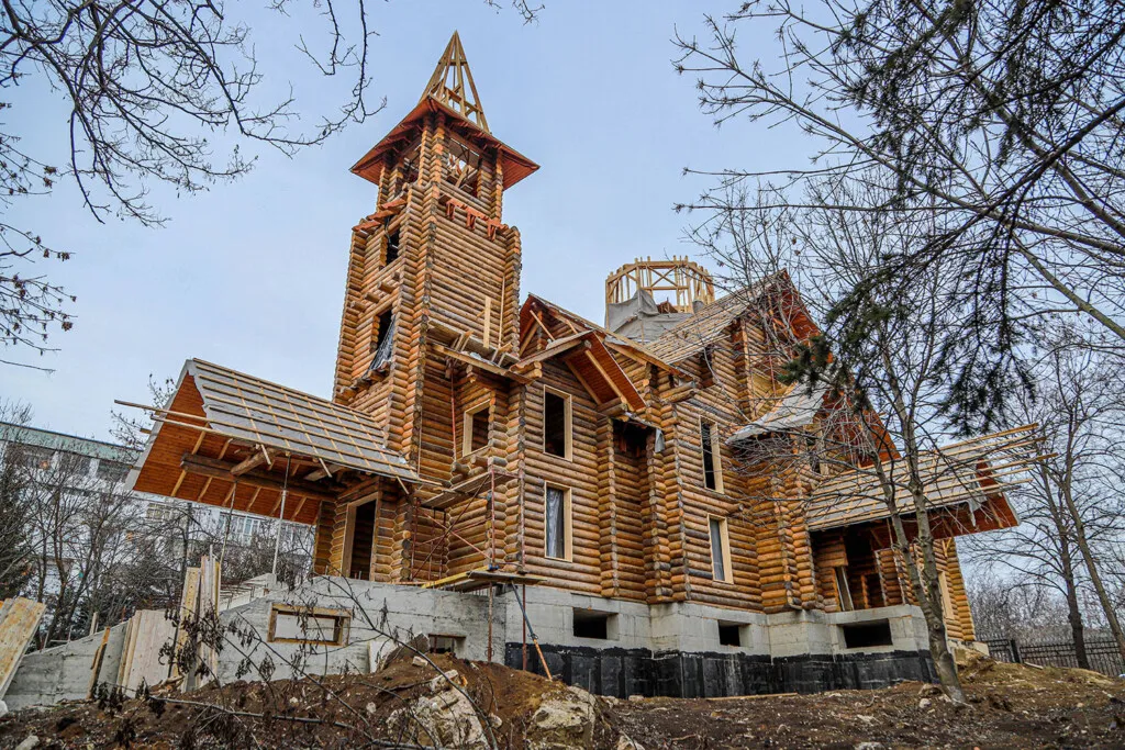 Octombrie 2021 – etapa de montare a lemnului pentru acoperiș cu continuare a turlei centrale și a clopotniței.