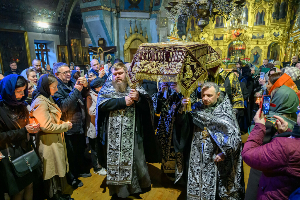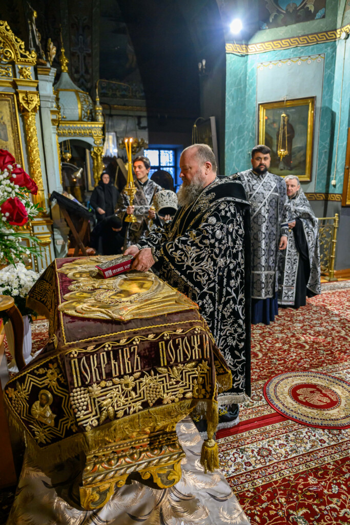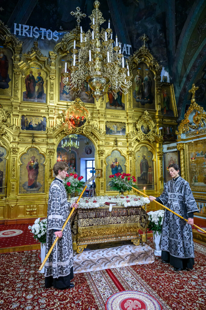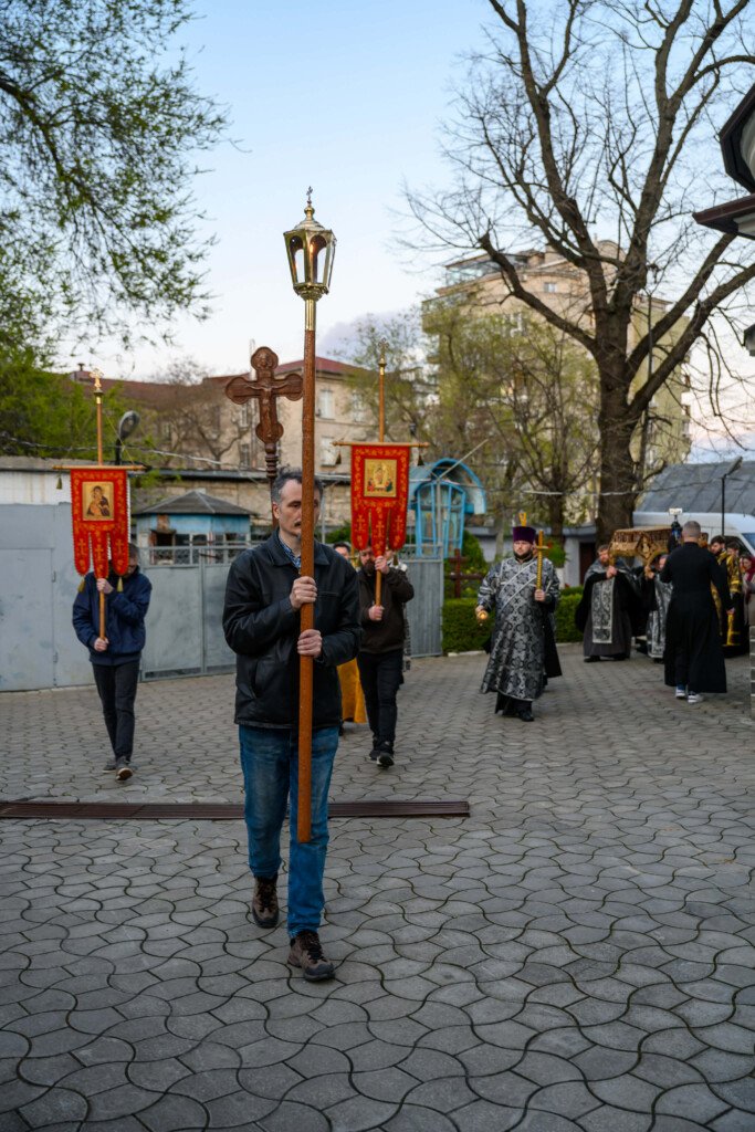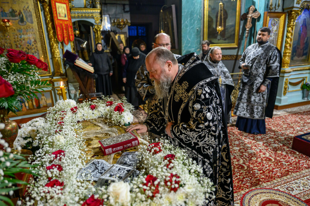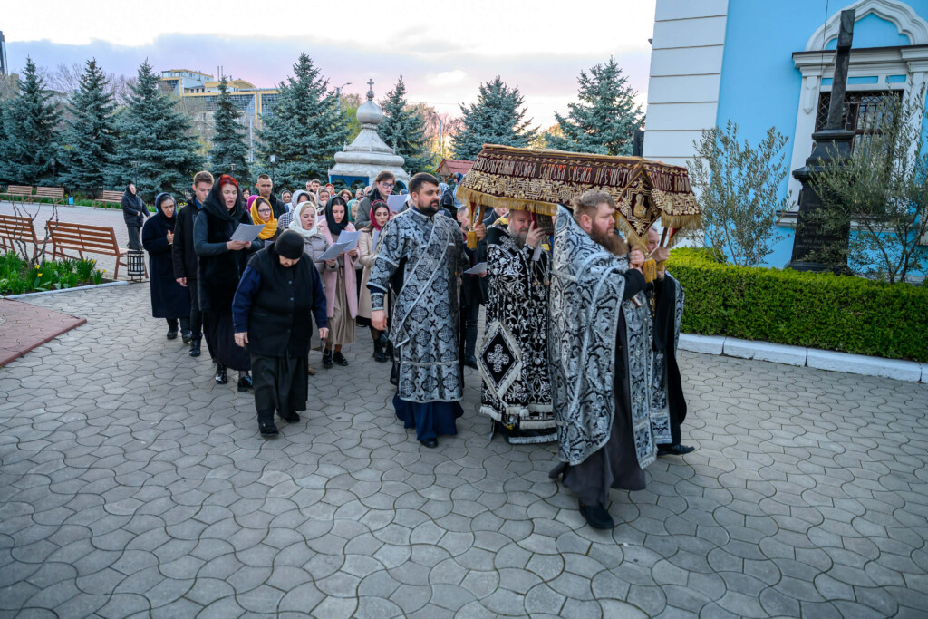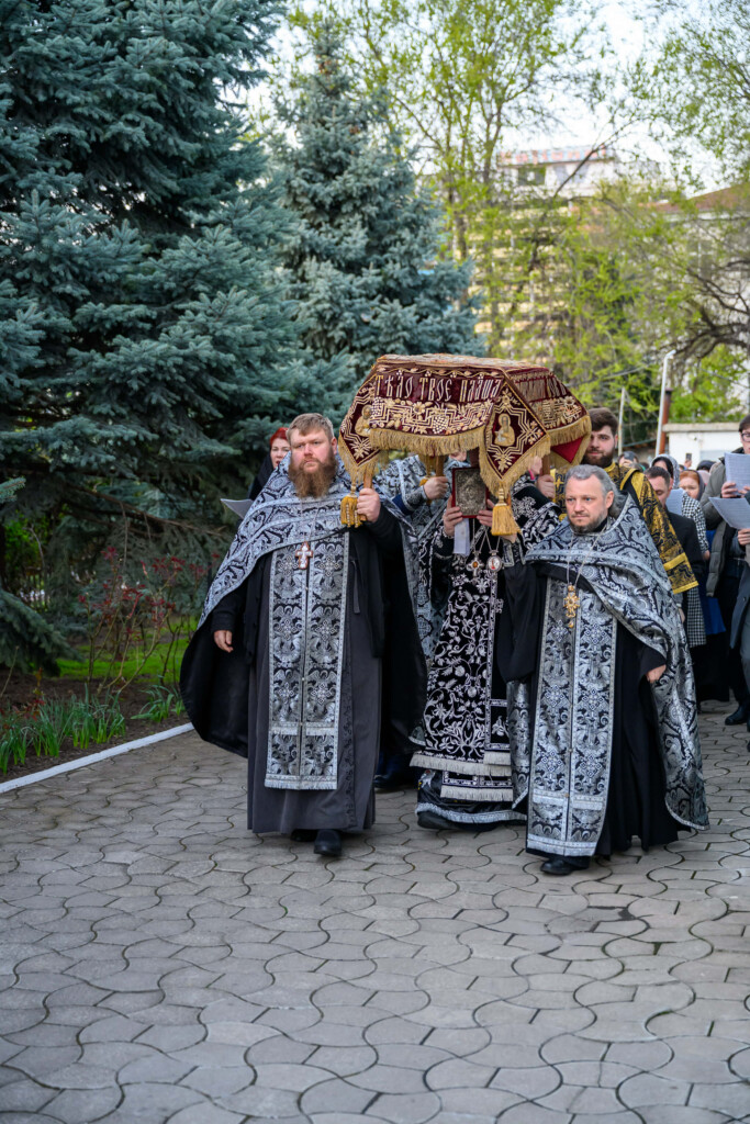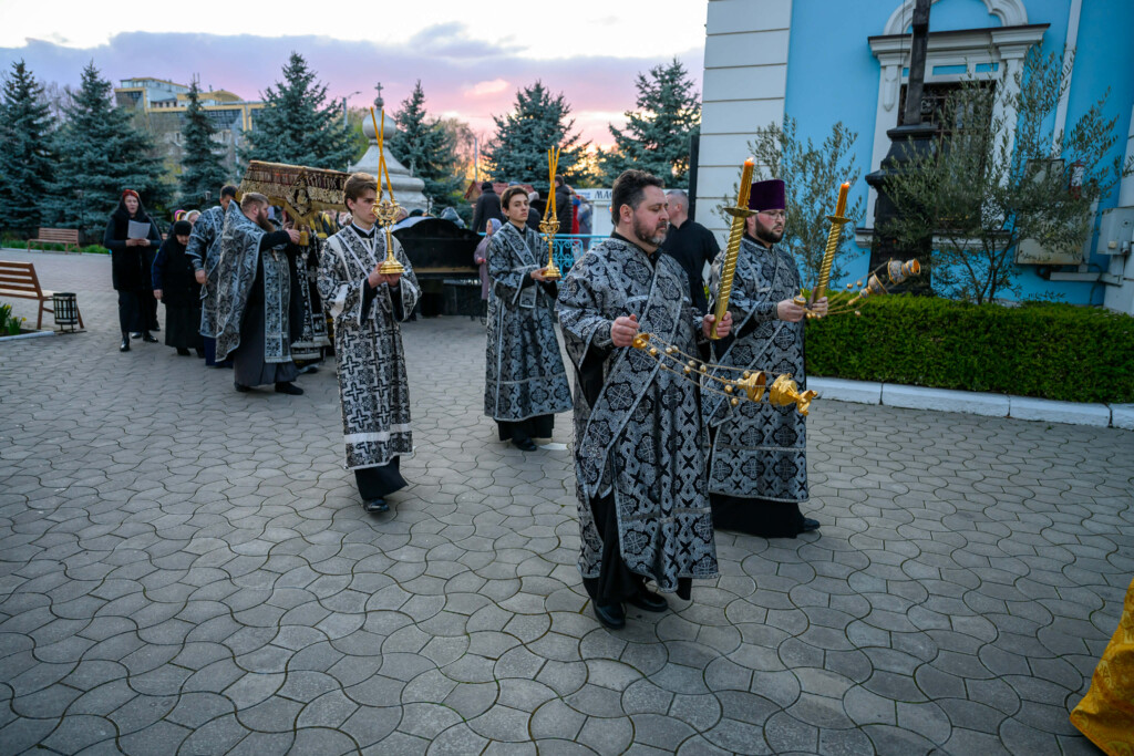 La sfârșitul Doxologiei Mari a avut loc tradiționala procesiune în jurul Catedralei mănăstirești care simbolizează ducerea către mormânt a Mântuitorului. Au fost patru opriri și la fiecare oprire a fost rostită o ectenie. După procesiune, toți credincioșii prezenți au trecut pe sub Sfântul Epitaf la intrarea în lăcașul de cult. Apoi, Sfântul Epitaf a fost așezat pe Sfânta Masă cântându-se troparul „Iosif cel cu bun chip”.