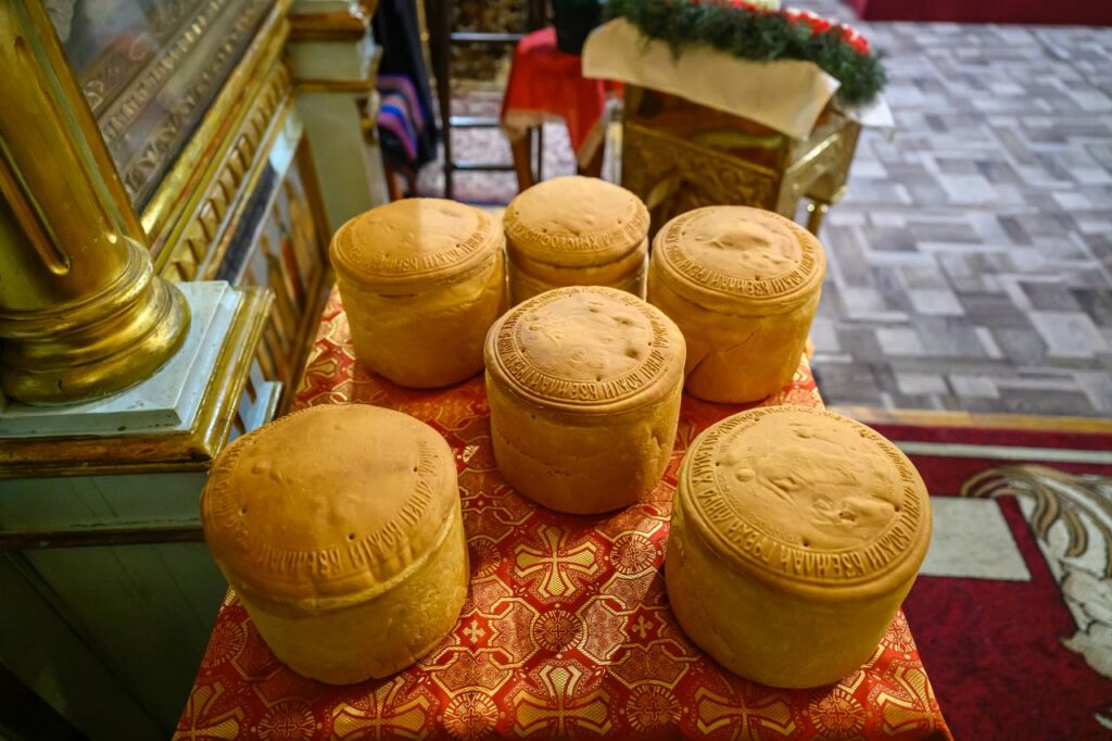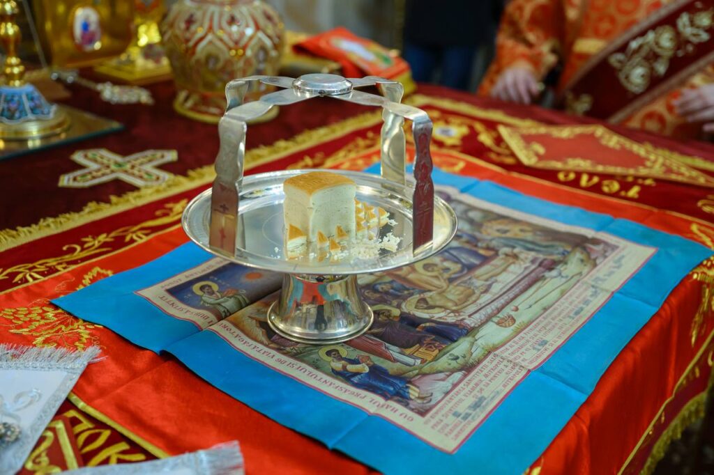 După oficierea Sfintei Liturghii, Preasfinția Sa împreună cu clericii au sfințit prinoasele aduse de către credincioși.