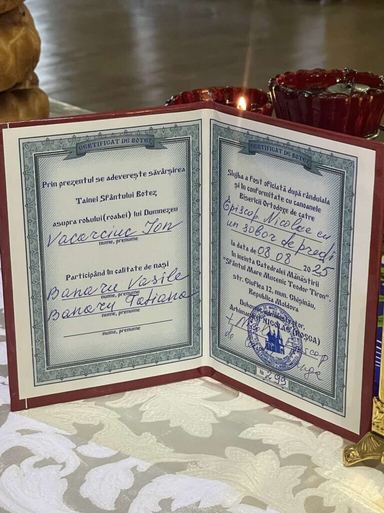 Vineri, 8 august 2025, la Mănăstirea Ciuflea din Chișinău, Preasfințitul Nicolae, Episcop de Ceadîr-Lunga, a săvârșit Taina Sfântului Botez pentru pruncul Ioan Vacarciuc.
