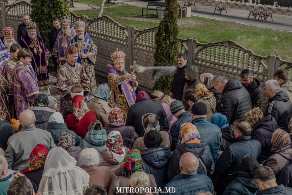 După Liturghie a urmat înconjurul ambelor biserici cu citirea celor patru evanghelii praznicale, a fost oficiată o litie morțească la mormântul părintelui Tudor Tudoreanu și un te-deum praznical.